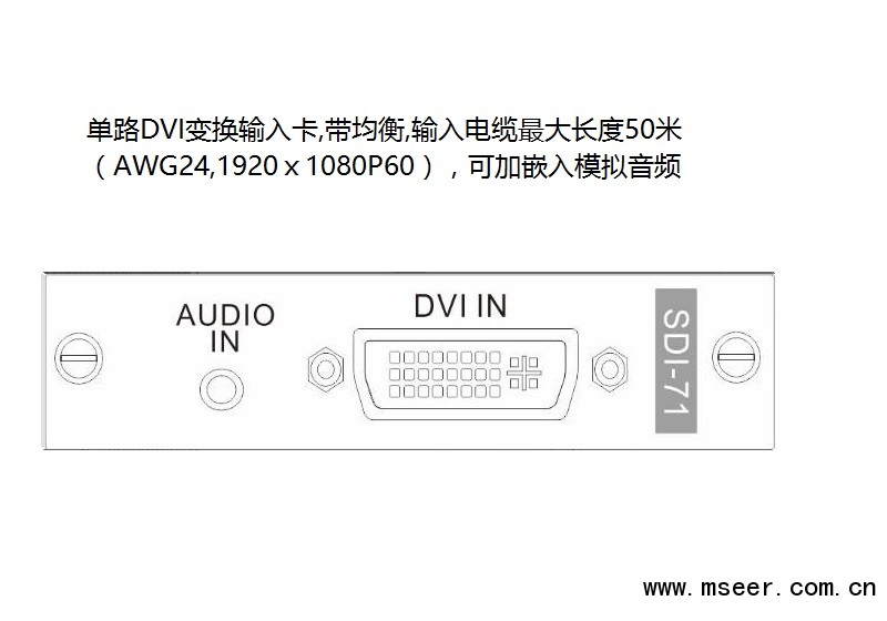 SDI-71 DVI 單通道變換輸入卡,配合SMD主機(jī)使用,采用獨(dú)立板卡設(shè)計(jì),每塊卡支持1路DVI-D輸入,帶均衡,輸入電纜最大長(zhǎng)度50米(AWG24,1920ⅹ1080P60),可加嵌入模擬音頻,支持最高1920x1200P60的數(shù)字高清圖像傳輸.