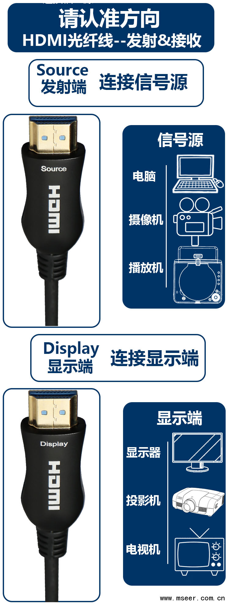 連接過(guò)程中,注意區(qū)分纜線的SOURCE 端和DISPLAY端,SOURCE 端接信號(hào)源,DISPLAY端接顯示器